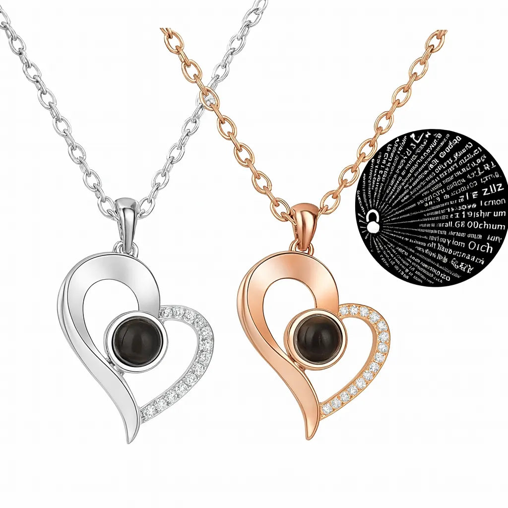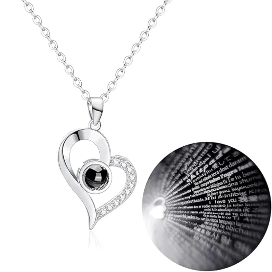 El cristal central del dije contiene un micrograbado con "Te amo" en 100 idiomas, visible al apuntar una luz (como el flash de tu celular) a través de el. proyectando el mensaje sobre una superficie cercana, puede ser sobre una pared.